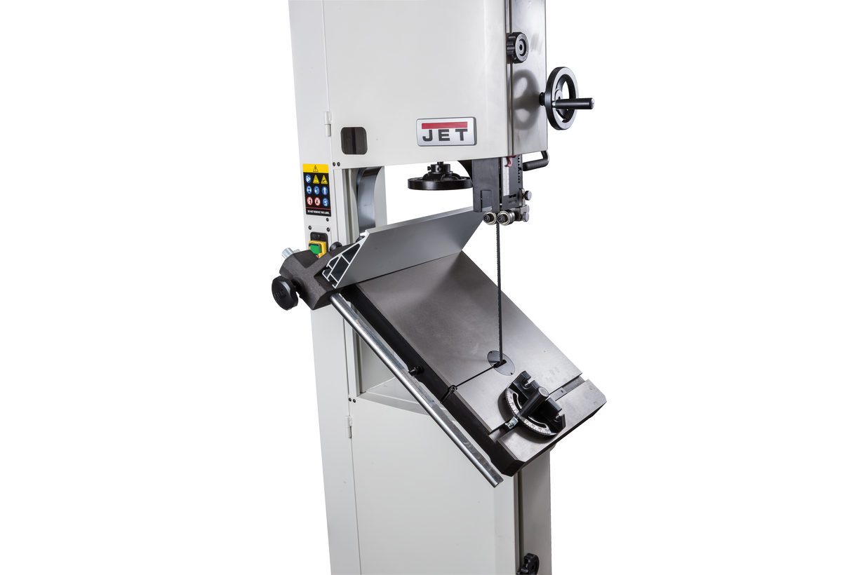 Jet JWBS-15 - ленточная пила нового поколения, предназначенная для профессионального использования. Ее основное преимущество, на фоне аналогов прошлых поколений, - увеличенная высота распиловки. Этот параметр очень важен для тех, кому нужен универсальный станок, способный взять на себя функции делительного. К подобным работам приспособлен и параллельный упор: направляющий профиль можно установить вертикально на боковую грань так, чтобы надежно фиксировать плоские заготовки при их роспуске на тонкие пластины. В целом конструкция бокового упора очень хорошо проработана и соответствует самым строгим требованиям: профиль жесткий и прочный, закреплен на массивном чугунном кронштейне, который перемещается по цилиндрической направляющей. Предусмотрена грубая (вручную) и точная (микрометрическим винтом) установка.