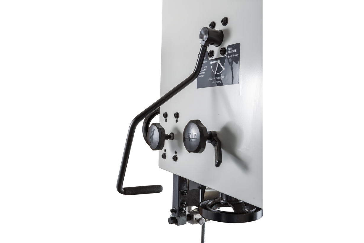 Механизм натяжения и центрирования ленты включает в себя две группы трехроликовых направляющих на шарикоподшипниках, стрелочный индикатор уровня натяжения, регулирующие маховики, два смотровых окошка и рычаг быстрого натяжения-ослабления. Он не совсем обычен, поскольку имеет не два, а три фиксированных положения: рабочее (плотно натянуто), для хранения (лента ослаблена, но держится на шкивах) и сервисное (для замены полотна). Чтобы улучшить плавность работы, использованы чугунные шкивы с массивным телом, а не в виде спицованных колес, как раньше.