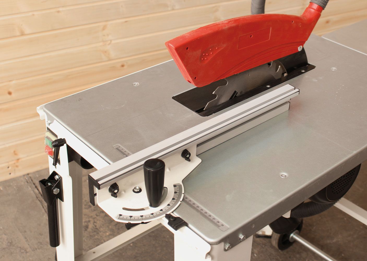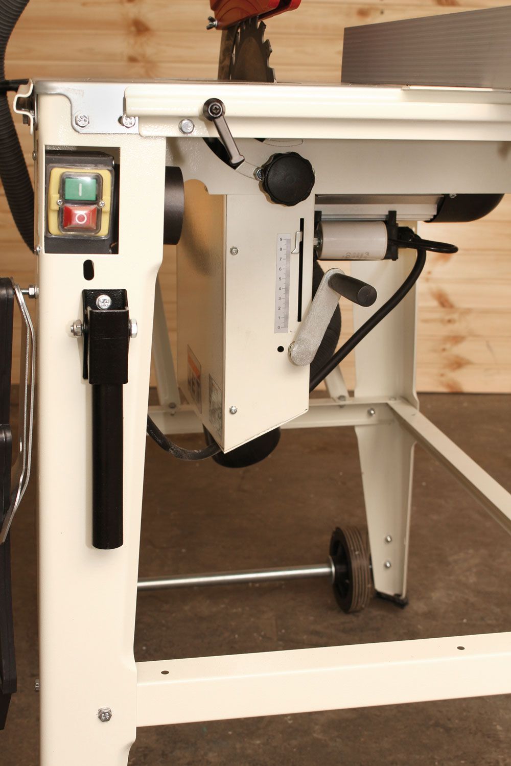Jet JTS-315LA — мобильная строительная пила с возможностью регулировки наклона и глубины пропила. Предусмотрены съёмный удлинитель стола (входит в стандартную комплектацию) и возможность работы с параллельным или угловым упором. Причем используется для этого один и тот же узел - это основа с угловым транспортиром и съёмная планка-удлинитель. Узел монтируют на поперечную направляющую, фиксируют стопорным винтом и используют как параллельный упор. Для выполнения угловых распилов и для торцевания упор переустанавливают на длинную сторону стола, вдоль которой он может скользить.